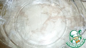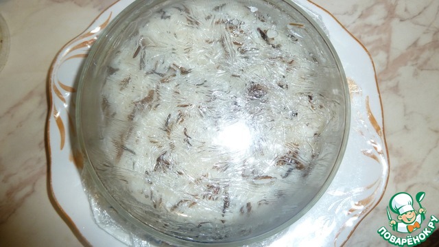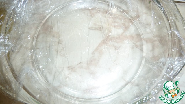 • Подготовим ёмкость, для сбора салата. Для этого постелим в глубокую тарелку пищевую плёнку, чуть смажу растительным маслом, чтобы потом легко перевернуть салат.