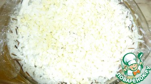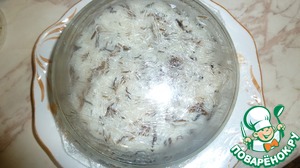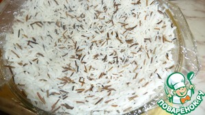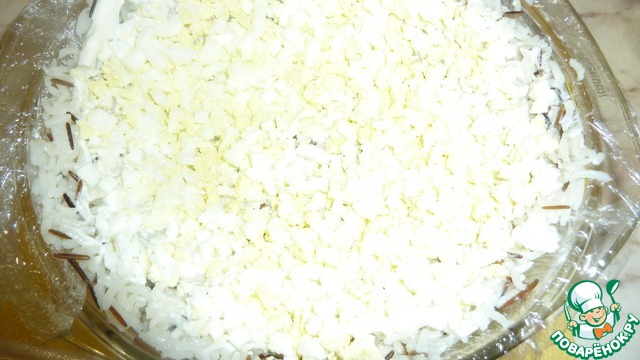 • На дно и по бокам кладём 1-ый слой-рис. Смазываем майонезом.