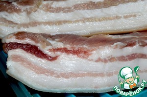 Сало нарезать на подходящие куски. Поскрести шкурку ножом и обрезать все ненужные и некрасивые места.