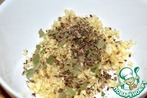 Чеснок измельчить, лавровый лист поломать, перец смолоть, а семена укропа растереть пальцами. Все перемешать.
