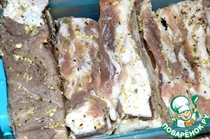 Натереть получившейся смесью куски сала и дать им полежать еще час на решетке, затем убрать на сутки в холодильник для пропитки. Затем сложить сало в пакеты и убрать в морозильник.