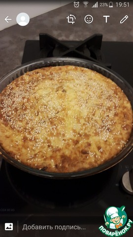 Поставить выпекать пирог, пока он не зарумянится сверху, у меня получается 40-45 минут, где то при 180 градусах.