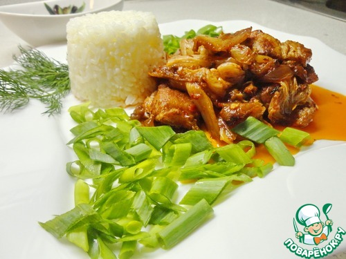 Все делаю, как в данном рецепте: жарю на растительном масле (предпочитаю масло из косточек винограда) нарезанное кусочками мясо до карамельного вида (солю по вкусу мясо, когда остается мало воды), затем добавляю нарезаный репчатый лук и жарю по рецепту. Затем добавляю нарезанное кимчи (предварительно хорошо промытое водой, смываю весь перец, чтобы не было очень остро) и морковку,
