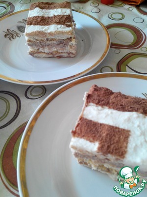 И собираем торт! Сначала пойдёт шоколодный слой. Печенье обмакиваем в какао-напитке и выкладываем. Промазываем шоколадным кремом.