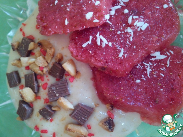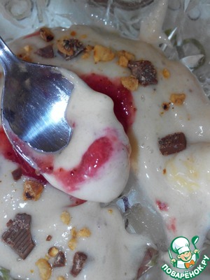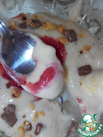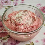 В пиалу выкладываем банановое мороженое, нарезанный клубничный, если можно так назвать, сорбет и добавляем любимый топпинг!