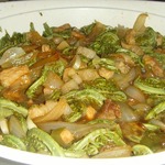 На растительном масле обжарить лук и свинину