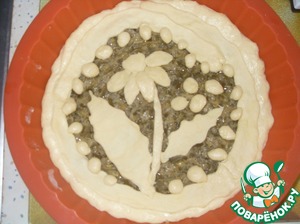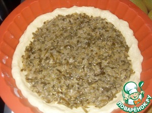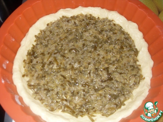 Из этих пропорций теста у меня выходит 2 пирога в форме 26 см. Можно просто от всего теста отделить кусок для украшения верха пирога, а остальное тесто распределить на протвине. Тесто легко разминается руками, даже катать не надо! Итак, я сделала в силиконовой форме 26 см. Распределяем тесто, делая бортики. Выкладываем начинку, бортики загибаем наверх.