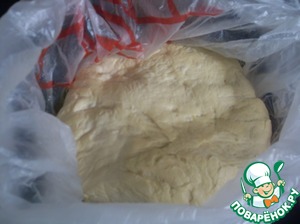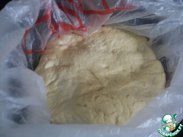 К сожалению, не помню рецепта теста, которое использовала моя бабуля. У нее был целый процесс! Она ставила на ночь, как она говорила, "квашенку", а утром замешивала на ней тесто. Поэтому использую сегодня Хрущевское тесто. Муку смешиваю с дрожжами, солью, сахаром, добавляю молоко. Начинаю замес, добавляю размягченное масло. После замеса тесто кладу в пакет и в холодильник на 4 часа. Можно даже с вечера сделать, а на следующий день выпекать.