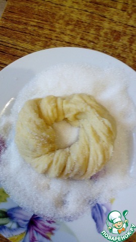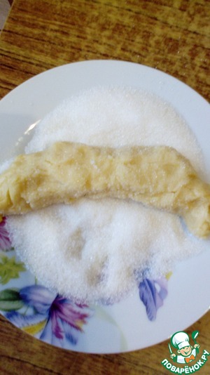 От общего теста нужно отщипнуть кусочек размером примерно с крупкое куриное яйцо (в этот раз я брала по 2 ст. л. теста на одну "барабульку"). И скатать его в колбаску длиной около 7 см и шириной примерно 3-4 см. Далее нам понадобится сахар. Сахар я насыпаю в блюдце и прокатываю по нему каждый жгутик теста. -