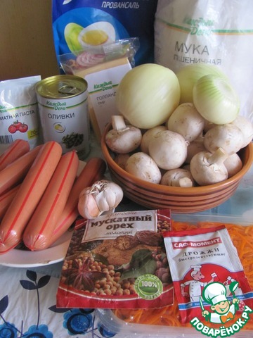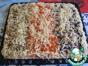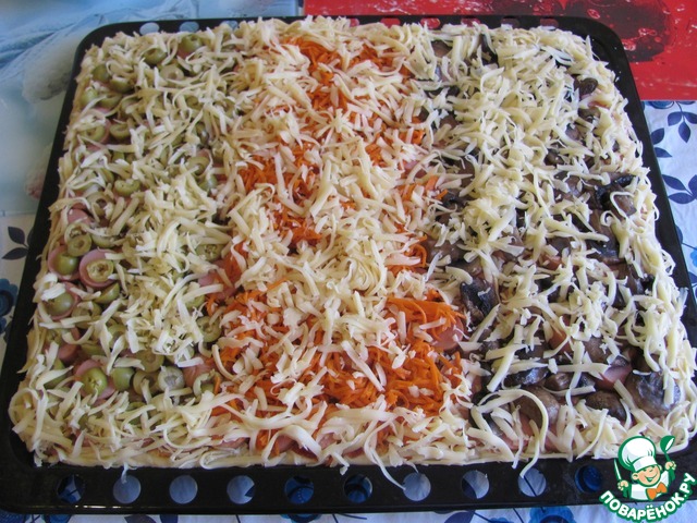 А потом - треть пиццы укрываем грибами, треть - оливками, треть - корейской морковушкой. Всё засыпаем сыром (особенно у бортиков погуще - это самое вкусное))) и отправляем в духовку 180 градусов до тех пор, как сыр расплавится. Достать и часть с морковкой хорошо помазать майонезом. Можно вообще всё помазать. Жирнее будет.))) Теперь вернуть в духовку.