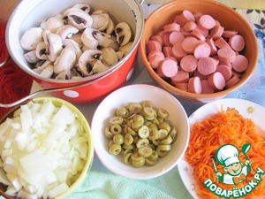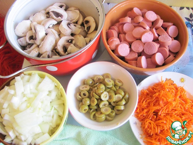 Шампиньончики режем пластинками, лучок мелко, сосиски и оливочки колечками, чесночок крошим ножичком. Морковочку я тоже предпочитаю не длинную.