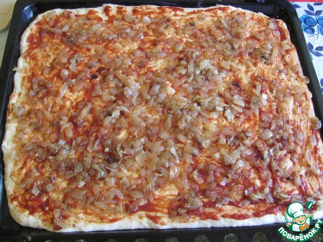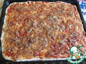 Противень смазать маслицем, вывалить тесто и распределить по противню. Погладить наше тесто ручонками, хорошо смазанными маслом. Затем совершить помаз томатной пастой. Сверху выложить слой жареного лука, посолить его по вкусу и хорошо сдобрить мускатным орехом.
