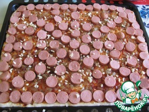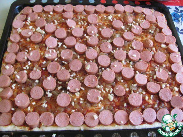 Далее разложить любимые вами сосисочки. Сверху притрусить чесночком.
