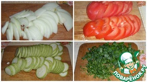 Продолжаем выкладывать : кабачки - помидоры - зелень. Добавляем теплую воду, растворив в ней соль. Накрываем форму фольгой и отправляем в разогретую духовку. Запекаем 40-45 минут при 160-180 градусах.