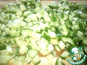 Огурец вымыть, нарезать кубиками. При нарезке стремиться все ингредиенты нарезать примерно одинакового размера.