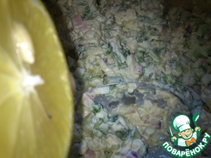 Смешать все ингредиенты в большой кастрюле. Добавить майонез и размешать, именно в таком порядке, словно мы делаем салат. В готовую окрошечную смесь добавляем 1 столовую ложку лимонного сока. Не лимонную кислоту, а именно лимонный сок. Перемешиваем.