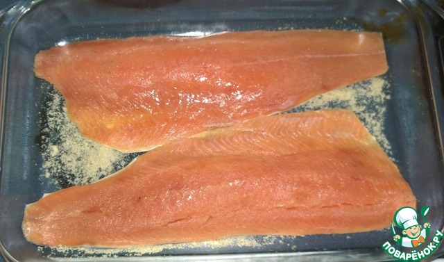 На дно смазанной любым жиром посуды для запекания насыпаем немного панировочных сухариков. Рыбу промокнём бумажными полотенцами и кладём на сухарики "валетиком".