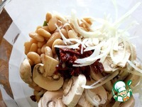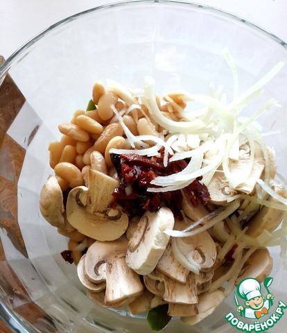 Добавьте нарезанные ломтиками сырые шампиньоны, нарезанный тонкой соломкой лук и нарезанные мелко вяленые томаты. Приправьте солью, специями и маслом, перемешайте. |