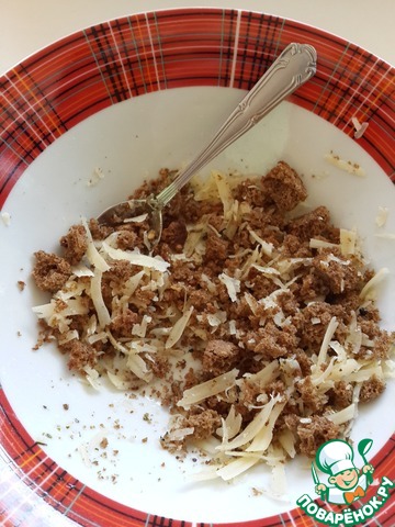 Бородинский или Рижский хлеб раскрошите, смешайте крошки с тертым сыром, также добавьте щепотку прованских трав. |