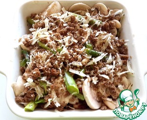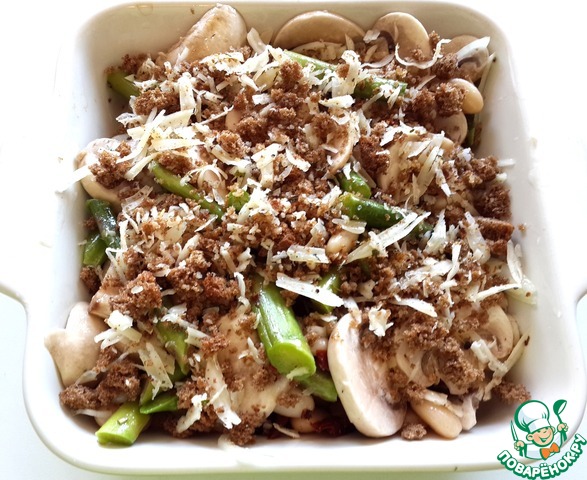 Сверху посыпьте хлебно-сырными крошками и запеките в духовке около 15 минут до корочки. |