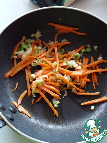 • Белую часть зеленого лука и морковь слегка поджарьте на масле.