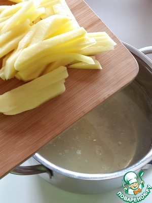 • Картофель нарежьте и добавьте в бульон, проварите 5 минут.