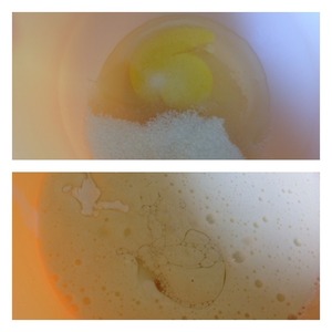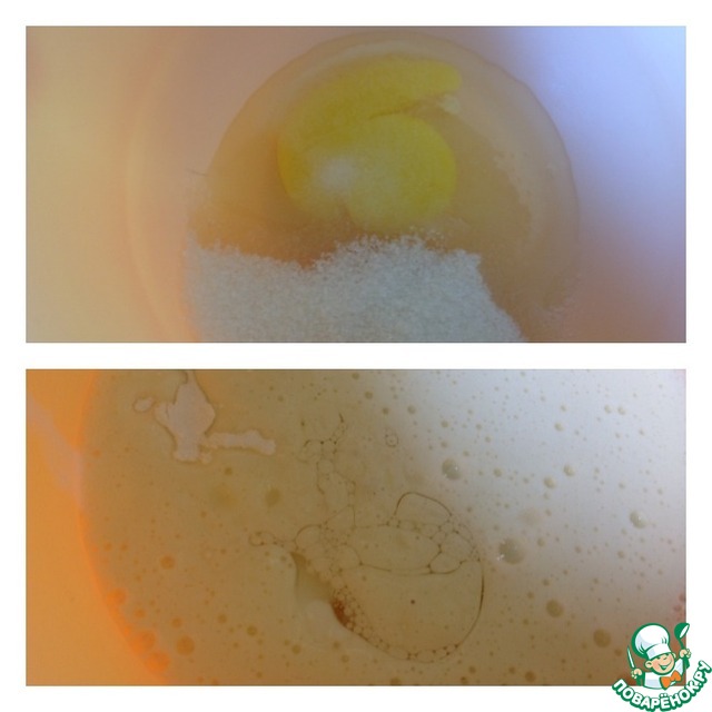• Яйцо взбить с сахаром. Влить масло и кефир. Всыпать соду и немного все взбить блендером.