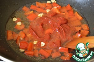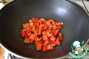 В большой сковороде (казане) разогреть растительное масло, обжарить перец 2 минуты. -