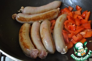 Сдвинуть перец в сторону, купаты (сосиски) обжарить со всех сторон до румяности. Выложить на время в тарелку.