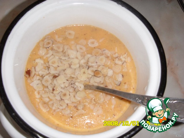 Оставить пирог, пока он не остынет, иначе он может развалиться. Теперь приготовим сироп, которым мы польем пирог сверху. Измерить полученный при отжатии тыквы сок. У меня получилось 60 г. Берем молока столько, чтобы тыквенный сок и молоко в сумме были 120 г. В моем случае - 60 г. Молоко, сок, 50 г масла, 3 ст. л. сахара и горсть орехов варить на сильном огне до загустения, постоянно помешивая.
