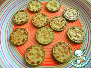 На большую тарелку раскладываем вначале самые крупные кабачковые кружочки.