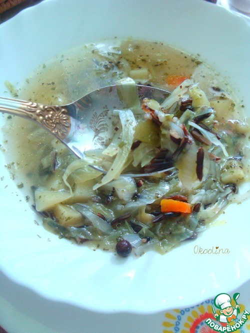Суп с овощами и молодой капустой, с чёрным рисом ТМ МИСТРАЛЬ АКВАТИКА WILD RICE на курином бульоне. В чёрном рисе высокое содержание белка и других питательных веществ.