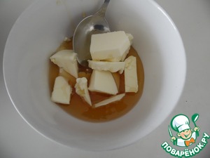 В отдельной кастрюле смешать мед, масло и соду. Поставить на водяную баню, на средний огонь, помешивать. Масса начнет пениться и увеличиваться в объеме.