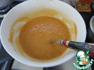 Продолжая помешивать, довести смесь до карамельного цвета, чем больше держать смесь, тем насыщенней будет цвет. Этот процесс берёт время 5-10мин. Снять кастрюлю с карамельной массой и, интенсивно помешивая, ввести яичную массу
