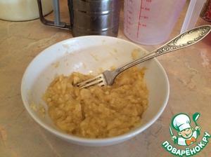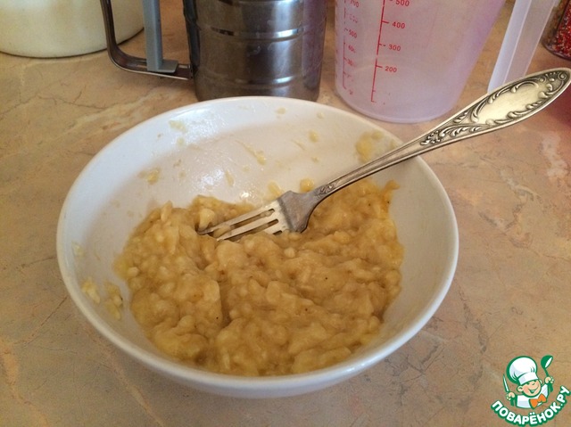 • Разминаем банан. Я делаю это либо вилкой, либо толкушкой, либо пестиком. Блендером не измельчаю банан, так как вкус у него меняется.