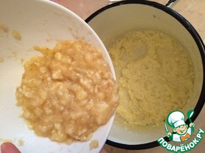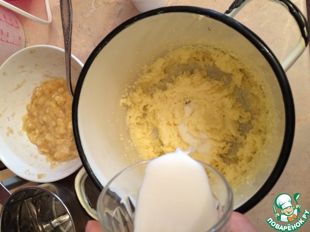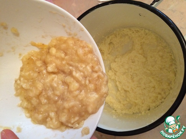 • Теперь добавляем измельченный банан (по консистенции он должен быть как пюре). Перемешиваем.