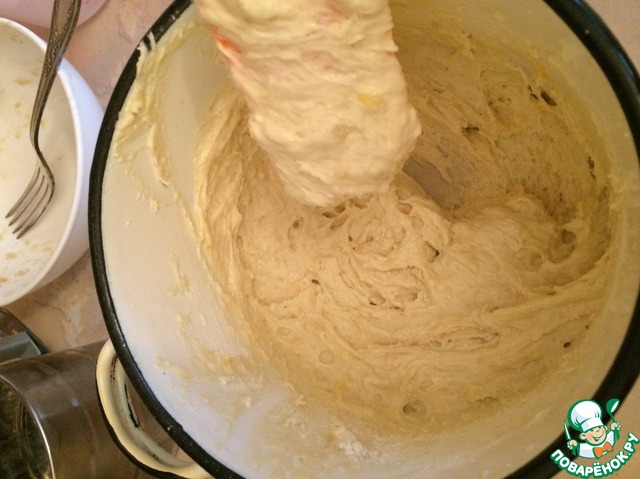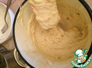 • Далее в получившуюся смесь постепенно добавляем муку. Все перемешиваем. Тесто должно получиться достаточно густое.
