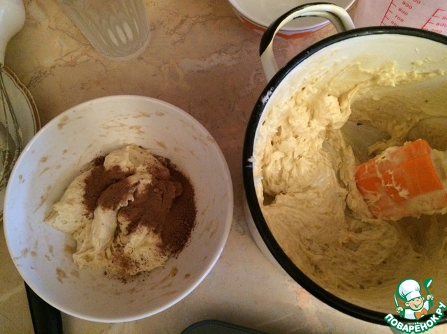 • Далее возможно несколько вариантов. Можно тесто оставить таким. А можно добавить в тесто 4 чайные ложки какао и размешать, тогда кексики получатся шоколадными. Также можно разделить тесто на 2 половины, к одной добавить 2 чайные ложки какао.