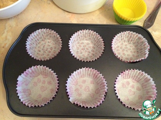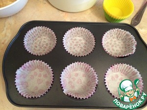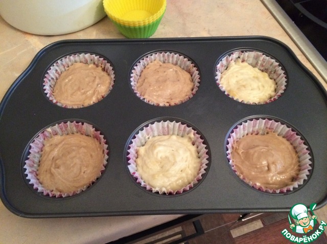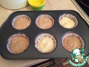 • Ложкой выкладываем тесто. Формочки полностью заполнять не нужно, так как тесто будет подыматься. Заполнить нужно на 3/4. Для того, чтобы получились мраморные кексы, нужно половину формочки заполнить белым тестом, половину шоколадным.