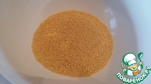 Кус-кус насыпаем в большую миску, с учетом того, что он сильно увеличится в объеме и и заливаем кипятком в соотношении на 1 чашку крупы - 2 чашки воды. Накрываем крышкой и забываем о нем минут на 15.
