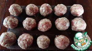 Скатать из фарша маленькие фрикадельки, размером с грецкий орех, выложить на разделочную доску и убрать в холодильник.