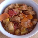 А вот и рецепт : Мясо режем на куски 4*5 см., обжариваем в глубоком казане на раскаленном масле, помешивая, зарумянили - добавляем резанный лук, обжарили лук до прозрачности - кладем кружки моркови, обжариваем, перемешивая. Заправляем толченой зирой, молотым кориандром, перцем, солим. Оставляем под крышкой на медл. огне на 10 минут. Выкладываем слой резаных помидоров, слой сладкого перца ( режем крупно на 4 - 6 частей), слой картофеля, слой баклажанов (заранее вымоченных в соленой воде). Закрываем, и на 1 ч. на медленном огне. Проследите, выделившийся сок не даст блюду пригореть. Через час проверьте готовность мяса и за 10 минут до окончания добавьте чеснок ( не чищенный), стручья острого перца ( кладите целыми с плодоножкой, это предотвратит весь выход остроты, а аромат отдаст полностью ) и яблоки ( айву ). Доведите солью до нужного вкуса. Через 10 - 15 минут, снимите с огня и добавьте измельченную зелень кинзы, она здесь подойдет идеально, но у меня ее не было, а подать летом овощное блюдо без яркой и сочной зелени было бы кощунственно, и я заменила кинзу петрушкой.