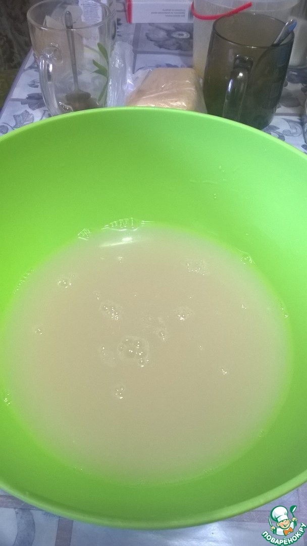 В тёплой воде разводим сахар и дрожжи, даём постоять минут 15 - пока не появится пенная шапка