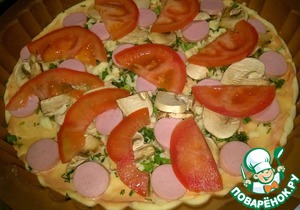 Моем и режем шампиньоны, зелень, сосиски или отварное мясо и любые другие выбранные вами ингредиенты (болгарский перец, лук, маслины). Кстати, ни с чем не сравнимую пикантность пицце придает... кабачок, особенно в сочетании с грибами. Не менее вкусен баклажан - хотя таких вариантов в пиццерии вы не встретите.