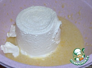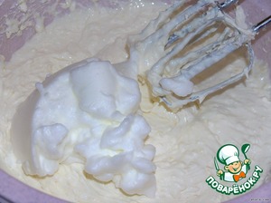 Желтки, сахар, натертая шкурка и сок лимона взбить хорошо. Добавить маскарпоне, перемешать.