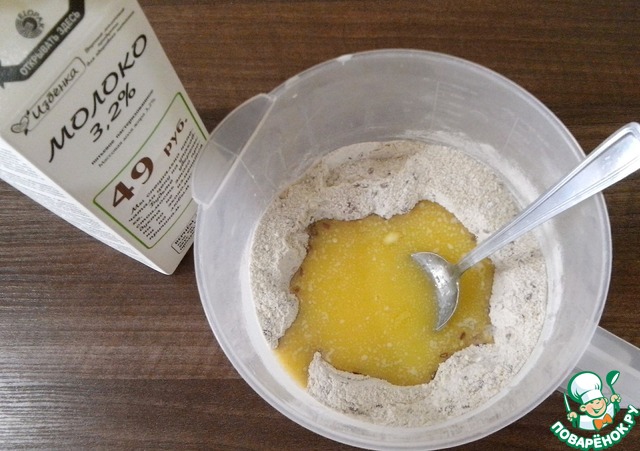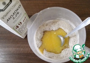 Отдельно смешать молоко, яйцо, мед и сливочное масло. Затем посередине в сухой смеси сделать небольшое углубление и влить жидкую смесь. Хорошо все перемешать. Я сначала смешиваю ингредиенты вилкой, а затем руками. Тесто совсем не липнет к рукам и посуде.