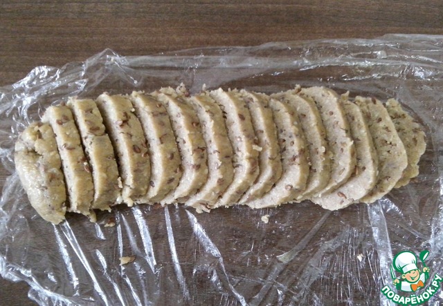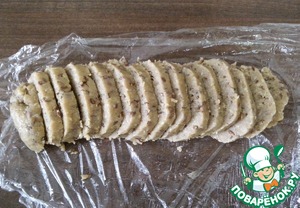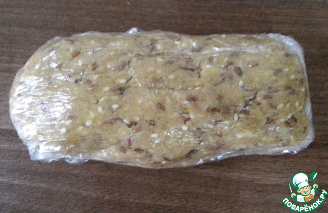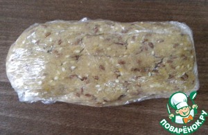 Формируем из теста колбаску и заворачиваем ее в пищевую пленку. Отправляем тесто в холодильник часа на 3.