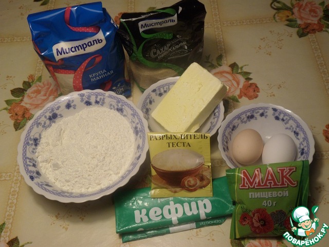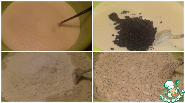 В чашку с манно-кефирной массой добавляем растопленный маргарин, взбитые яйца, распаренный мак. Перемешиваем. Добавляем просеянную муку и разрыхлитель теста. Хорошо перемешиваем.