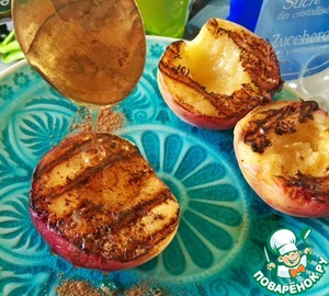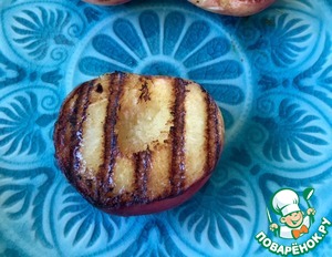 Выньте косточки. Смажьте сковороду гриль сливочным маслом. Положите персики срезом вниз.
