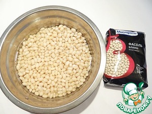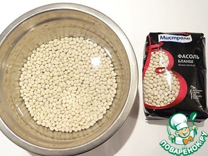 Для приготовления этого блюда используется крупная белая фасоль. К сожалению, такой я не нашла у нас, поэтому приготовила это блюдо из мелкой белой фасоли бланш ТМ "Мистраль". Фасоль замачиваю в холодной воде на ночь.